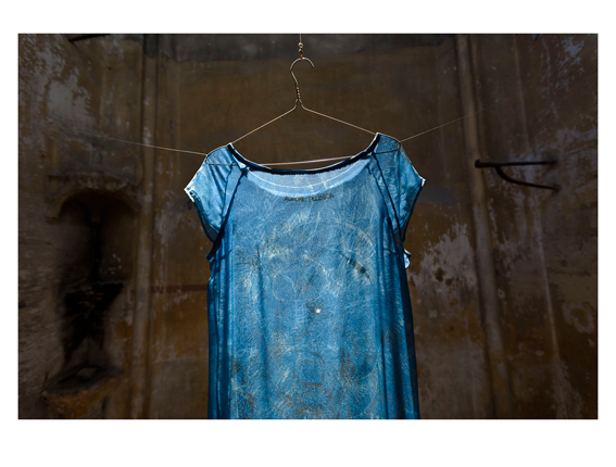6x4x4 mètres / 30 mètres de mousseline de soie, teinture végétale à l’indigo, sérigraphie, batik / Avignon / France