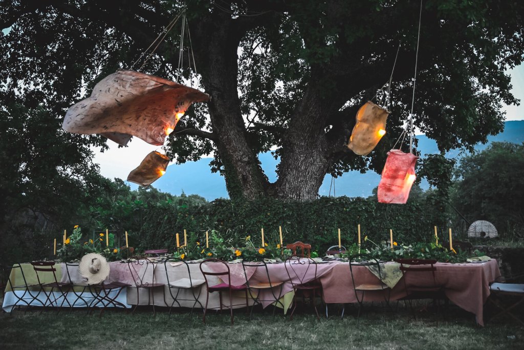 Forage feast photography “.…Beauty, in other words, lifts life out of the anaesthetizing effects of the pedestrian and gives us reason for going on, for being, for ranging beyond our boundaries, for endeavouring always to be more than we are. It enables us to pause in time long enough to remember that some things are worth striving for, that some things are worth doing over and over again until they become their breathless selves”, wrote Sister Joan Chittister who is so wise she almost makes me want to believe in god…And these are the words that are on my mind after last night’s dinner under an oak tree adorned with silk lanterns made by Aurore Pelisson as part of thefrenchmuse workshop. » Ruth Ribeaucourt. Aurore is a super chic French artist who dyes silks and linens with plants and then makes the sublime fabric into floating lanterns like this, but also dresses and scarves and other lovely things.” Annabelle Hickson