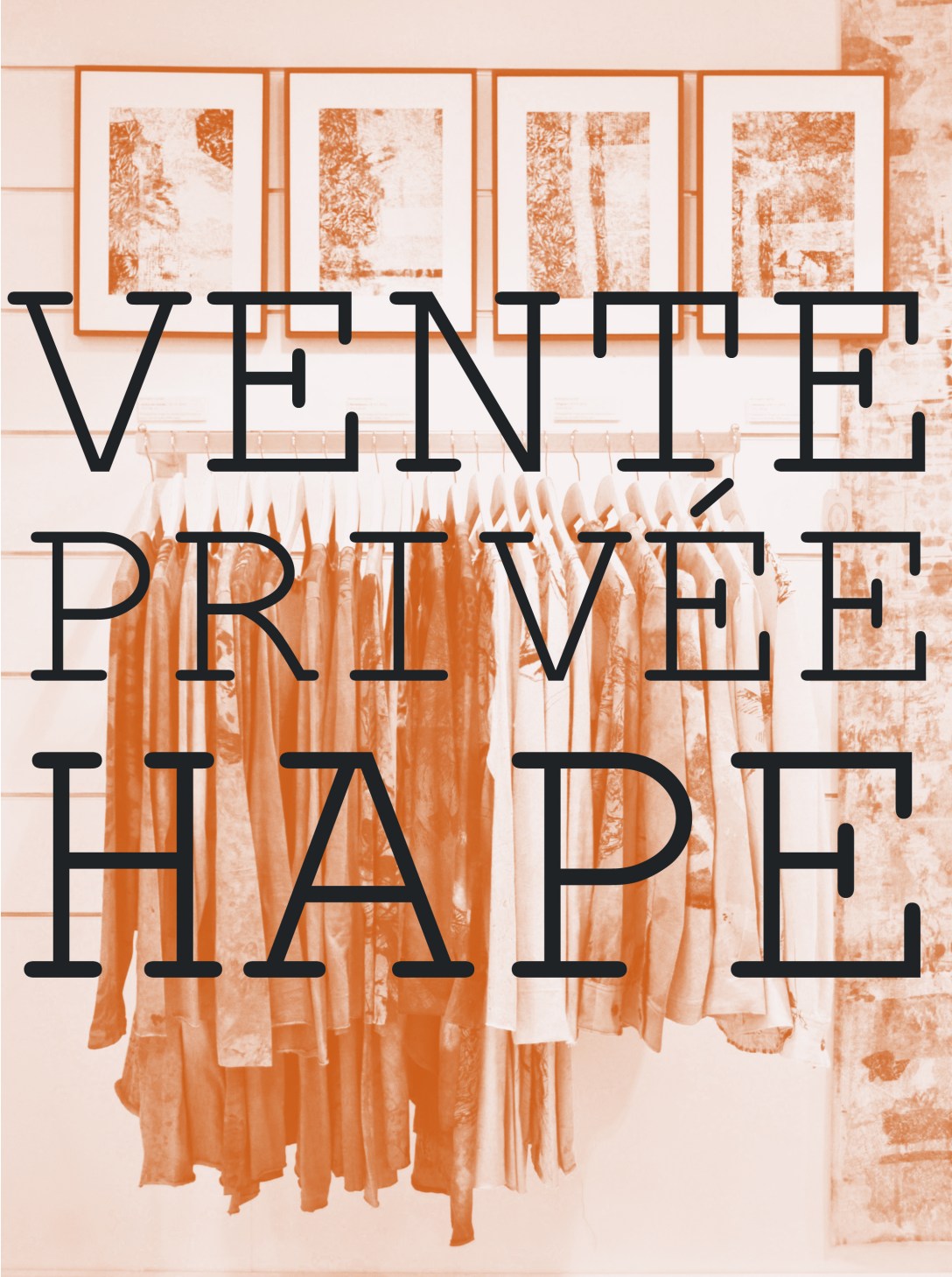 EXCEPTIONNEL chez HAPE - VENDREDI 20 JANVIER de 10h à 20h VENTE PRIVEE -20% sur une large sélection d'articles textiles -10% sur l'exposition de photographie de Bérangère Leydier Toute la journée venez chiner les pièces de vos rêves dans une ambiance chaleureuse, autour d'une tasse de thé la journée et d'un apéritif festif en fin d'après midi.… Lire la suite Vente privée HAPE textile